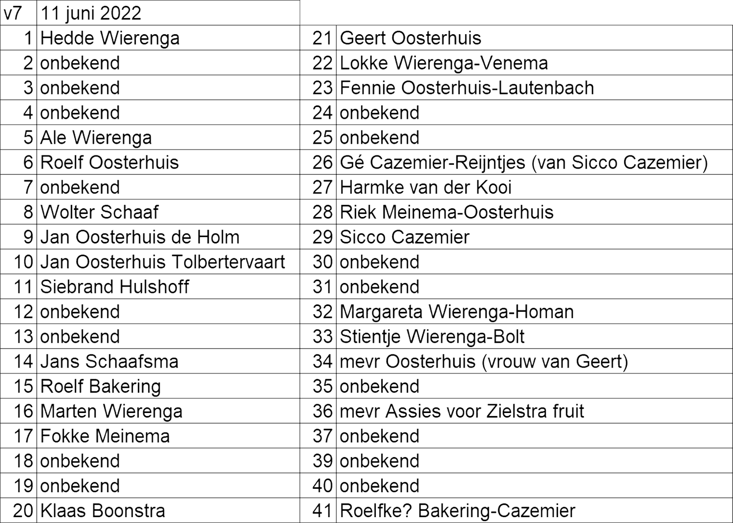 Als u met de muis een persoon aanwijst (niet klikken) verschijnt de naam. Dit werkt alleen op een PC, dus niet op een tablet of smartphone. Er zijn nog veel namen onzeker. Wij zouden graag het jaartal en de ontbrekende namen toevoegen. Als u die weet stellen we een e-mail zeer op prijs. Om het wat gemakkelijker te maken staat er een tweede foto met de onbekenden en twijfel gevallen omcirkeld, afgewisseld met de nummers corresponderend met de namenlijst daar onder. Een e-mail graag naar redactie@cazemierboerderij.nl